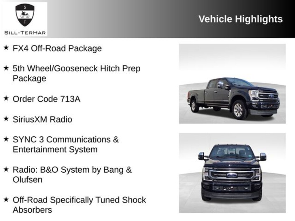 This 2021 Ford F-350SD is rare!, 110V/400W Outlet, 5th Wheel/Gooseneck Hitch Prep Package, FX4 Off-Road Package, Hill Descent Control, Off-Road Specifically Tuned Shock Absorbers, Order Code 713A, Radio: B&O System by Bang & Olufsen, SiriusXM Radio, SYNC 3 Communications & Entertainment System, Twin Panel Power Moonroof, Unique FX4 Off-Road Box Decal.